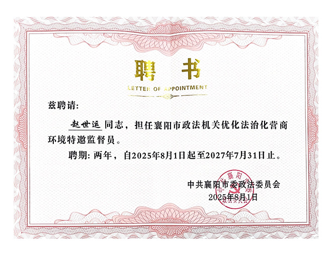 日前,從襄陽市政法委獲悉,萬洲電氣董事長、總經理趙世運被聘為市政法機關優化法治化營商環境特邀監督員。