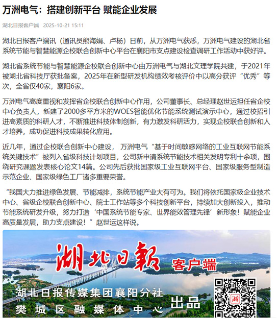 湖北省系統(tǒng)節(jié)能與智慧能源企校聯(lián)合創(chuàng)新中心由萬洲電氣與湖北文理學(xué)院共建,于2021年被湖北省科技廳獲批備案,2025年在新型研發(fā)機(jī)構(gòu)績效考核評價(jià)中以高分獲評“優(yōu)秀”等次,全省僅40家,襄陽6家。